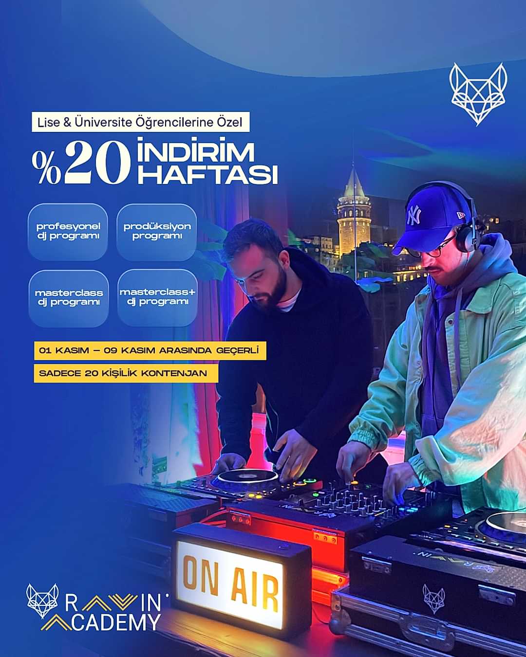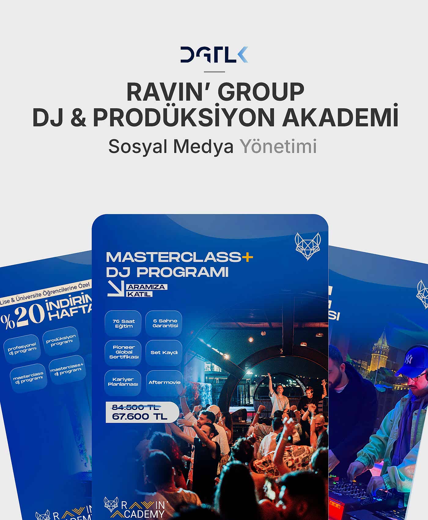 Ravin Group’un dinamik dünyasına uygun; enerjisi yüksek, modern ve dikkat çekici reklam görselleri hazırladık. DJ ve prodüksiyon akademisinin vizyonunu yansıtan bu tasarımlar, markanın dijital görünürlüğünü güçlendirirken hedef kitlesiyle daha güçlü bir bağ kurmasını sağladı.